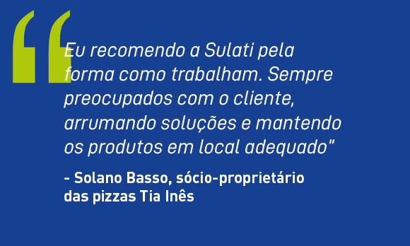 Quem confirma isso é Solano Basso. Há 19 anos como empresário, ele sabe bem a importância do cuidado em todas as etapas. Como sócio-proprietário das pizzas Tia Inês, ele preza pela qualidade da produção, mas também pela segurança no caminho até a casa dos consumidores. Por isso, ele escolheu a Sulati para armazenar com profissionalismo.